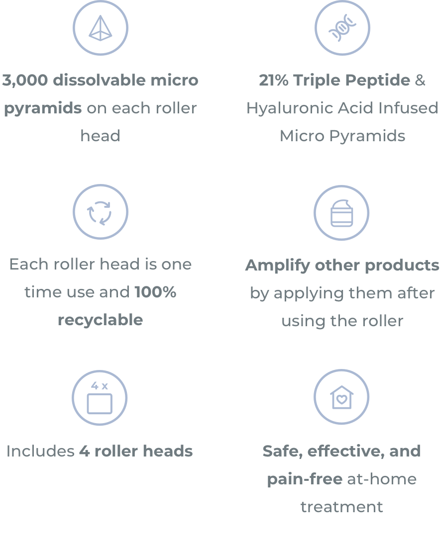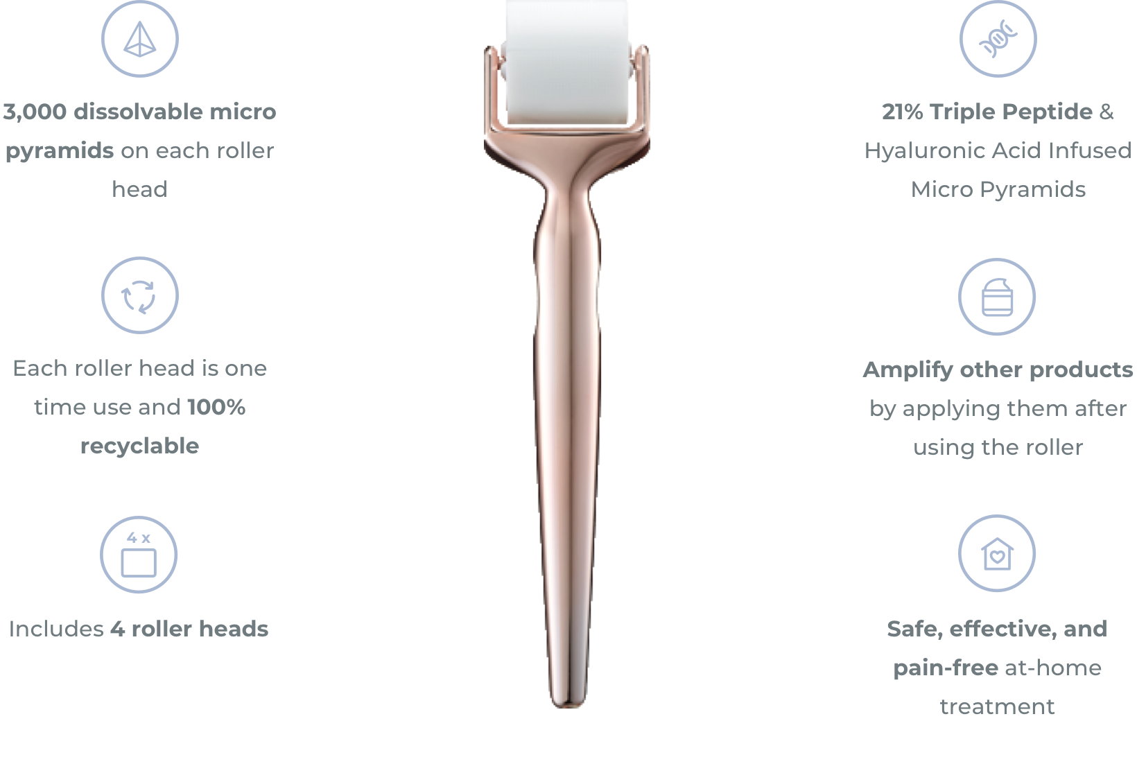Each micro roller head contains 3,000 micro pyramids made of powerful, healthy skin care ingredients. When you roll it over your skin, the ingredients penetrate and dissolve into deeper layers of your skin, making them much more effective. By applying your regular serums and moisturizers after using the roller, they're also able to penetrate deeper into your skin and therefore be much more effective. Not only does the roller itself provide amazing benefits, but it also amplifies the effects of your other products!